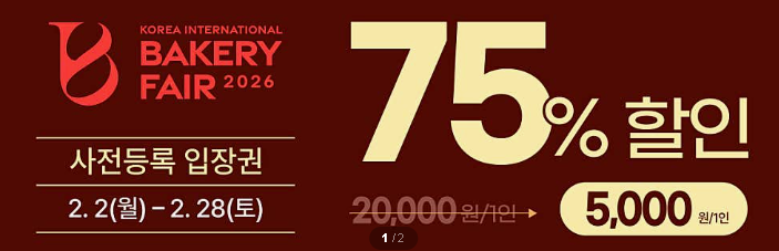 2026 한국국제베이커리페어 일반 관람권 정가는 2만 원이지만, 사전등록 기간에는 1인 5,000원으로 예매가 가능하다. 할인율로 따지면 약 75%에 해당해, 방문 계획이 있다면 사전등록을 하지 않을 이유가 거의 없는 구조다.